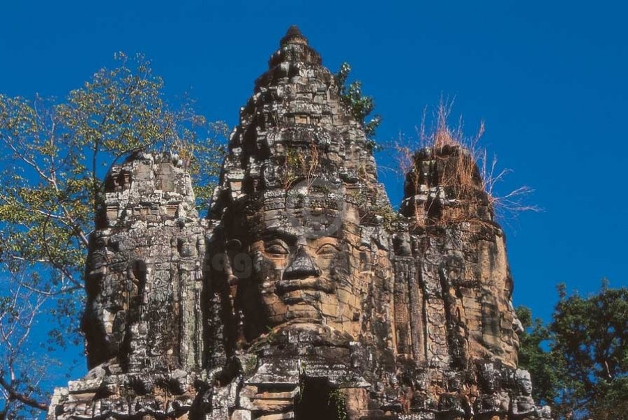 South Gate. Angkor Thom was founded by Jayavarman VII and was one of the largest cities of Khmer empire. Its modern name means Great capital city. It is sqaure in size enclosed by a moat and a 8 m high wall running 3 km on each side covering an area of 900 hectares. The moat is 100 m wide and 5 to 6 m deep. There are four gates 23 m high on all four sides with an additional gate known as victory gate on the east. On its south gate, the passage is flanked by 108 devatās and asuras churning the ocean of milk passing across the moat. Inside the wall, in each corner, a small temple called Prasat Chrung is located. (Image # 00231).