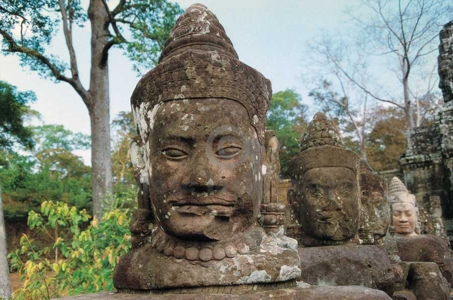 Devatas in Samudramanthan. - outside Angkor Thom. Angkor Thom was founded by Jayavarman VII and was one of the largest cities of Khmer empire. Its modern name means Great capital city. It is sqaure in size enclosed by a moat and a 8 m high wall running 3 km on each side covering an area of 900 hectares. The moat is 100 m wide and 5 to 6 m deep. There are four gates 23 m high on all four sides with an additional gate known as victory gate on the east. On its south gate, the passage is flanked by 108 devatās and asuras churning the ocean of milk passing across the moat. Inside the wall, in each corner, a small temple called Prasat Chrung is located. (Image # 00232).