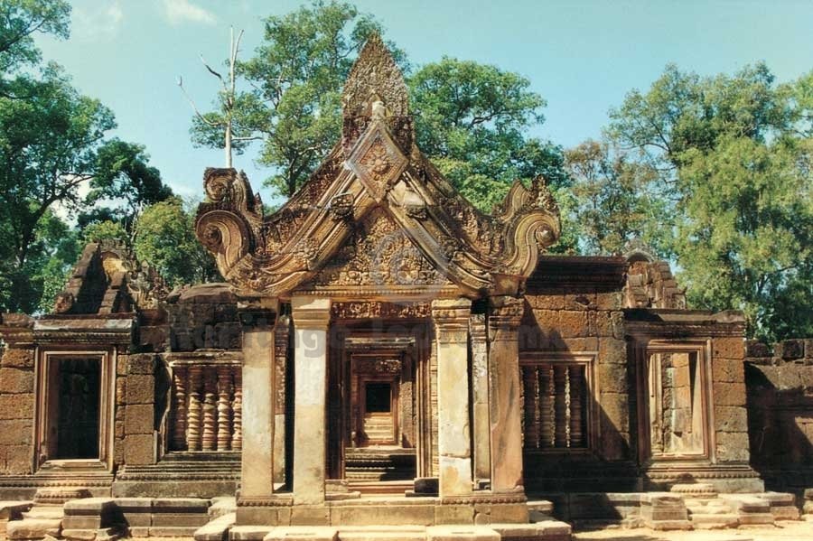 Main Entrance - Banteay Srei Temple. Originally named as the temple of “Shrī Tribhuvan Maheshwar”, Banteay Srei is dedicated to Lord Shiv. It was founded by Yajñavarāh, the spiritual teacher of King Jayavarman V in A.D. 967 in the ancient locality called Īshvarpur near Phnom Dei. Beautifully carved in pink stone, Banteay Srei was discovered in 1914 and restored from 1931 to 1936 through the process of anastylosis. (Image # 00108).