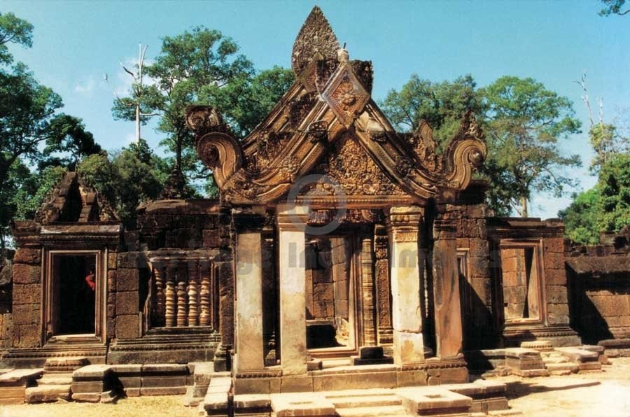 Main Entrance - Banteay Srei Temple. Originally named as the temple of “Shrī Tribhuvan Maheshwar”, Banteay Srei is dedicated to Lord Shiv. It was founded by Yajñavarāh, the spiritual teacher of King Jayavarman V in A.D. 967 in the ancient locality called Īshvarpur near Phnom Dei. Beautifully carved in pink stone, Banteay Srei was discovered in 1914 and restored from 1931 to 1936 through the process of anastylosis. (Image # 00109).