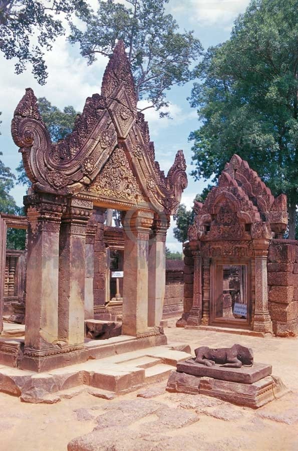 Main Entrance from inside - Banteay Srei Temple. Originally named as the temple of “Shrī Tribhuvan Maheshwar”, Banteay Srei is dedicated to Lord Shiv. It was founded by Yajñavarāh, the spiritual teacher of King Jayavarman V in A.D. 967 in the ancient locality called Īshvarpur near Phnom Dei. Beautifully carved in pink stone, Banteay Srei was discovered in 1914 and restored from 1931 to 1936 through the process of anastylosis. (Image # 00113).