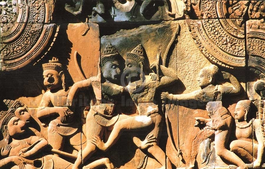 Bali & Sugrive Duel and Shri Ram & Shri Laxman - Door Pediment - Banteay Srei Temple. Originally named as the temple of �ShrÄ« Tribhuvan Maheshwar�, Banteay Srei is dedicated to Lord Shiv. It was founded by Yaj�avarÄh, the spiritual teacher of King Jayavarman V in A.D. 967 in the ancient locality called Īshvarpur near Phnom Dei. Beautifully carved in pink stone, Banteay Srei was discovered in 1914 and restored from 1931 to 1936 through the process of anastylosis. (Image # 00115).