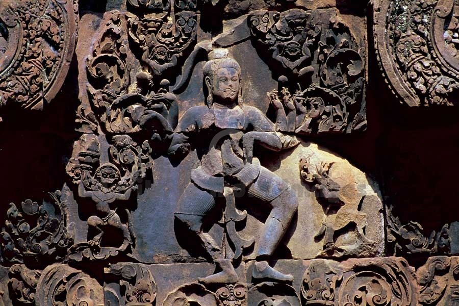 Lord Shiv performing Tandav dance - Door Pediment - Banteay Srei Temple. Originally named as the temple of “Shrī Tribhuvan Maheshwar”, Banteay Srei is dedicated to Lord Shiv. It was founded by Yajñavarāh, the spiritual teacher of King Jayavarman V in A.D. 967 in the ancient locality called Īshvarpur near Phnom Dei. Beautifully carved in pink stone, Banteay Srei was discovered in 1914 and restored from 1931 to 1936 through the process of anastylosis. Lord Shiv to whom the temple is dedicated represents Universal Consciouness and Goddess Pārvati, the Cosmic Energy. In ancient Cambodia, Lord Shiv was worshipped in the form of an image and as a sacred Shivalinga. The sacred Shivalinga is a symbol of the formless and absolute aspect of Lord Shiv. (Image # 00118).