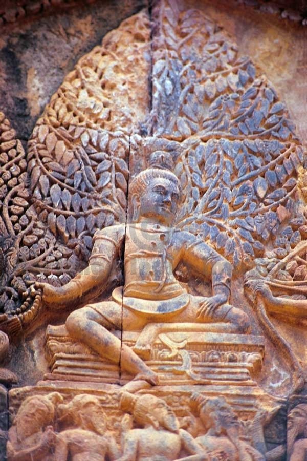 Lord Shiv and Kamdev - Door Pediment - Banteay Srei Temple. Originally named as the temple of “Shrī Tribhuvan Maheshwar”, Banteay Srei is dedicated to Lord Shiv. It was founded by Yajñavarāh, the spiritual teacher of King Jayavarman V in A.D. 967 in the ancient locality called Īshvarpur near Phnom Dei. Beautifully carved in pink stone, Banteay Srei was discovered in 1914 and restored from 1931 to 1936 through the process of anastylosis. (Image # 00120).