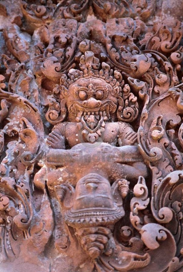 Narsimha Avatar of Lord Vishnu killing Hiranyakashipu - Door Pediment - Banteay Srei Temple. Originally named as the temple of “Shrī Tribhuvan Maheshwar”, Banteay Srei is dedicated to Lord Shiv. It was founded by Yajñavarāh, the spiritual teacher of King Jayavarman V in A.D. 967 in the ancient locality called Īshvarpur near Phnom Dei. Beautifully carved in pink stone, Banteay Srei was discovered in 1914 and restored from 1931 to 1936 through the process of anastylosis. (Image # 00122).