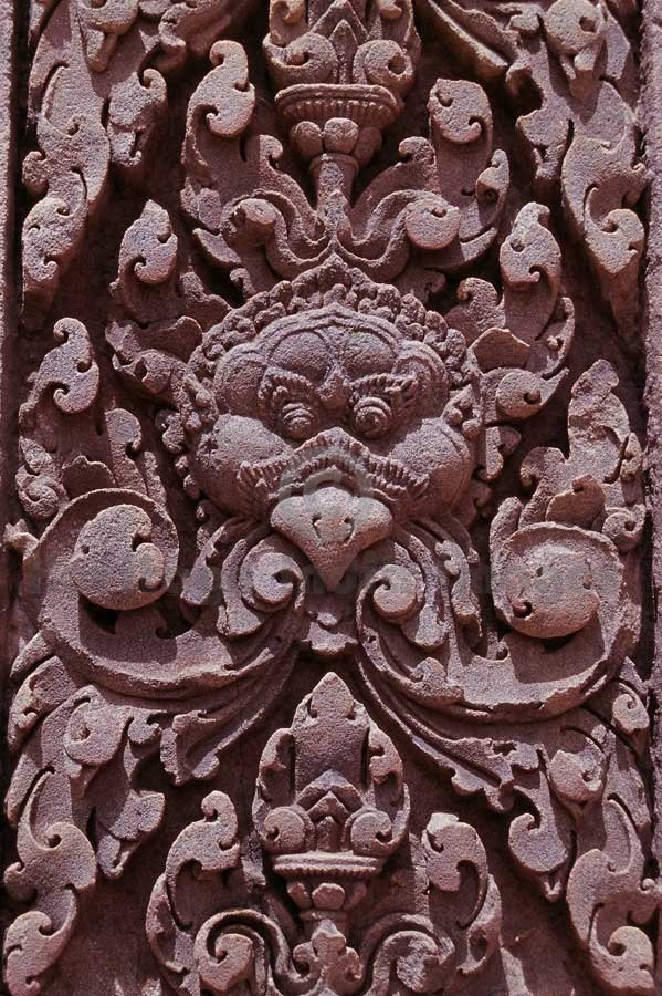 Kal, the mythological being - Pillar - Banteay Srei Temple. Originally named as the temple of “Shrī Tribhuvan Maheshwar”, Banteay Srei is dedicated to Lord Shiv. It was founded by Yajñavarāh, the spiritual teacher of King Jayavarman V in A.D. 967 in the ancient locality called Īshvarpur near Phnom Dei. Beautifully carved in pink stone, Banteay Srei was discovered in 1914 and restored from 1931 to 1936 through the process of anastylosis. (Image # 00123).