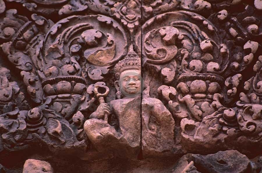 Shri Varun, God of Water - Door Pediment - Banteay Srei Temple. Originally named as the temple of “Shrī Tribhuvan Maheshwar”, Banteay Srei is dedicated to Lord Shiv. It was founded by Yajñavarāh, the spiritual teacher of King Jayavarman V in A.D. 967 in the ancient locality called Īshvarpur near Phnom Dei. Beautifully carved in pink stone, Banteay Srei was discovered in 1914 and restored from 1931 to 1936 through the process of anastylosis. (Image # 00124).