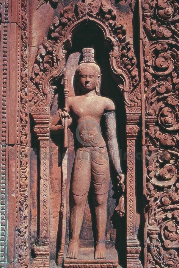Yogi in a niche of the shrine - Banteay Srei Temple. Originally named as the temple of “Shrī Tribhuvan Maheshwar”, Banteay Srei is dedicated to Lord Shiv. It was founded by Yajñavarāh, the spiritual teacher of King Jayavarman V in A.D. 967 in the ancient locality called Īshvarpur near Phnom Dei. Beautifully carved in pink stone, Banteay Srei was discovered in 1914 and restored from 1931 to 1936 through the process of anastylosis. Yogi, the ascetics, adorn the niches of Banteay Srei Temple. (Image # 00129).