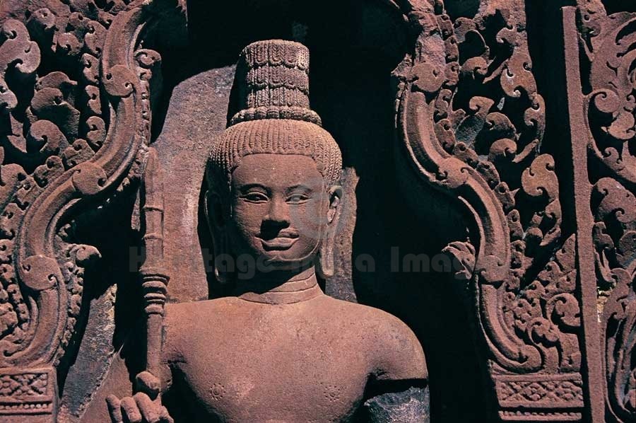 Yogi in a niche of the shrine - Banteay Srei Temple. Originally named as the temple of “Shrī Tribhuvan Maheshwar”, Banteay Srei is dedicated to Lord Shiv. It was founded by Yajñavarāh, the spiritual teacher of King Jayavarman V in A.D. 967 in the ancient locality called Īshvarpur near Phnom Dei. Beautifully carved in pink stone, Banteay Srei was discovered in 1914 and restored from 1931 to 1936 through the process of anastylosis. Yogi, the ascetics, adorn the niches of Banteay Srei Temple. (Image # 00130).