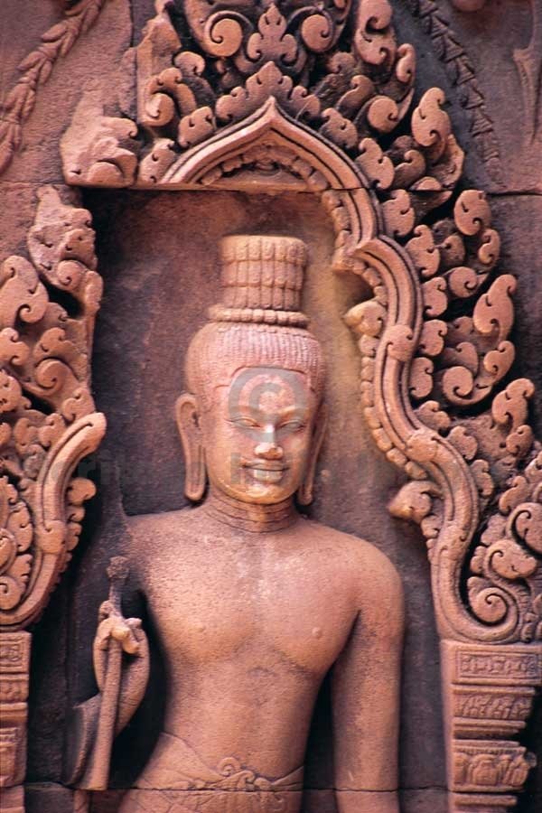 Yogi in a niche of the shrine - Banteay Srei Temple. Originally named as the temple of “Shrī Tribhuvan Maheshwar”, Banteay Srei is dedicated to Lord Shiv. It was founded by Yajñavarāh, the spiritual teacher of King Jayavarman V in A.D. 967 in the ancient locality called Īshvarpur near Phnom Dei. Beautifully carved in pink stone, Banteay Srei was discovered in 1914 and restored from 1931 to 1936 through the process of anastylosis. Yogi, the ascetics, adorn the niches of Banteay Srei Temple. (Image # 00133).