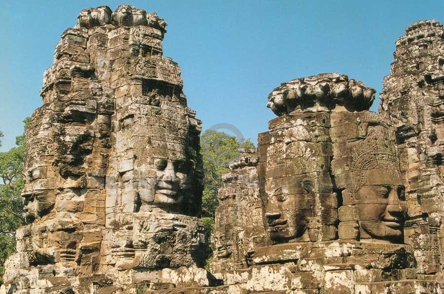 Compassionate face Towers - Bayon. Dedicated to Lord Shiv and Lord Buddh, it was bulit by King Jayavarman VII in the end of the 12th century. It has 54 face towers and bas relief galleries. Situated at the centre of Angkor Thom, Bayon was the state temple of Jayavarman VII. Its structure and architecture are relatively complex. It is famous for its face towers which were originally supposed to be 54 or 49 but now only 34 are remaing at the site. Most of these temple towers have faces carved on their four sides but there are some which have faces only on their one or two sides. The outer enlosure of the temple measures 156 m x 141 m. The inner closure is 80 m x 70 m. The main structure of the temple has galleries, corner pavilions and gopuras. The Bayon by its structure seems to have been used for the Hindu and Buddhist worship. The iconography belongs to both the religions. (Image # 00248).
