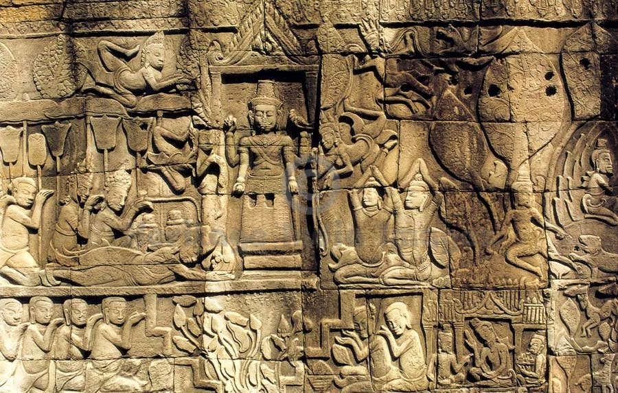 Shri Vishnu - Bas Releif Gallery - Bayon. Dedicated to Lord Shiv and Lord Buddh, it was bulit by King Jayavarman VII in the end of the 12th century. Bayon has two sets of bas reliefs carved in its galleries. The first set has the subjects mainly from history like battle with Chāms and many scenes from the daily life of the people at that time. The second set is in the inner side seems to be carved at a later period and depicts palace scenes, processions and divinities. (Image # 00254).