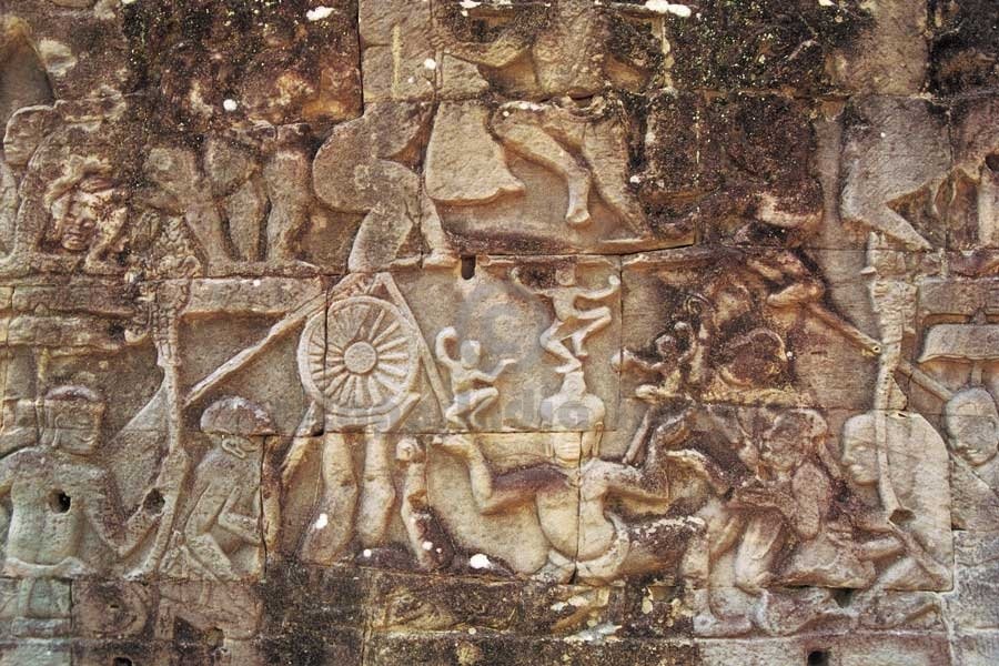 Bas Releif Gallery - Bayon. Dedicated to Lord Shiv and Lord Buddh, it was bulit by King Jayavarman VII in the end of the 12th century. Bayon has two sets of bas reliefs carved in its galleries. The first set has the subjects mainly from history like battle with Chāms and many scenes from the daily life of the people at that time. The second set is in the inner side seems to be carved at a later period and depicts palace scenes, processions and divinities. (Image # 00259).