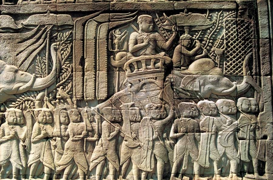 Bas Releif Gallery - Bayon. Dedicated to Lord Shiv and Lord Buddh, it was bulit by King Jayavarman VII in the end of the 12th century. Bayon has two sets of bas reliefs carved in its galleries. The first set has the subjects mainly from history like battle with Chāms and many scenes from the daily life of the people at that time. The second set is in the inner side seems to be carved at a later period and depicts palace scenes, processions and divinities. (Image # 00260).