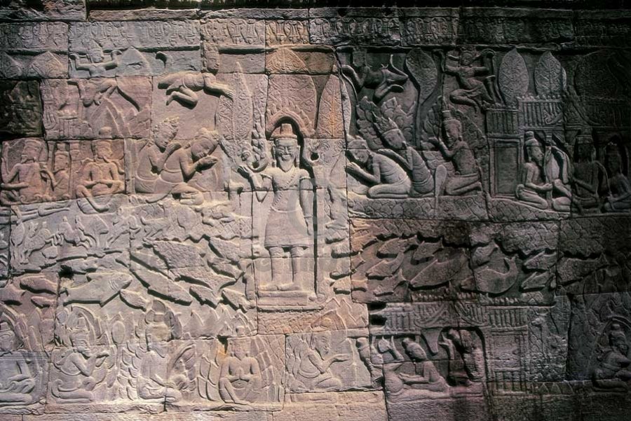 Bas Releif Gallery - Bayon. Dedicated to Lord Shiv and Lord Buddh, it was bulit by King Jayavarman VII in the end of the 12th century. Bayon has two sets of bas reliefs carved in its galleries. The first set has the subjects mainly from history like battle with Chāms and many scenes from the daily life of the people at that time. The second set is in the inner side seems to be carved at a later period and depicts palace scenes, processions and divinities. (Image # 00261).
