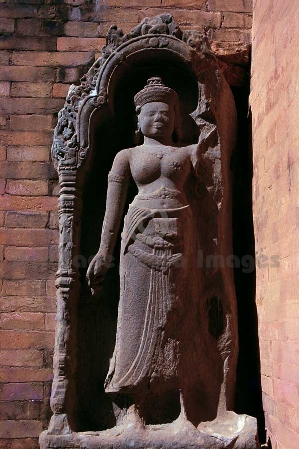 Preah Ko meaning the sacred Ox for Nandi - Dwarpalika in a niche of a Shrine. Originally called “Shrī Parmeshwar” and dedicated to Lord Shiv and Goddess Devi, it was built by King Indravarman I in A.D. 889 in the capital “Hariharālaya”. (Image # 00145).