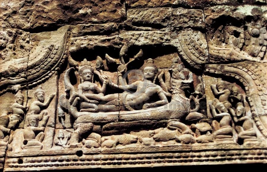 Preah Khan. - Lord Vishnu on Sheshnag. Dedicated to Lord Vishnu and Lord Buddh, it was bulit by King Jayavarman VII in AD 1191 in memory of his father. Preah Khan was conscerated in 1191 to Boddhisatva Lokeshwara, Jayavarmeshwar. It was built by Jayavarman VII in the memory of his father Dharanindravarman. The statue was placed in the central sanctuary. There are three temples around the central sanctuary. The north temple is dedicated to Lord Shiv, west temple to Lord Vishnu and south temple to other deities. According to the insctiption found in the temple, 1500 tonnes of copper was used for ornamenting the walls. The entrance of the temple is flanked by devatās and asuras and people were residing inside its premises. It is located on the north of its own baray called Jayatatāk covering 56 hectares. It was a temple, monastery and a centre of learning. (Image # 00216).