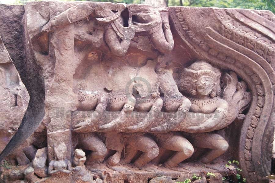 Preah Khan - A scene from Samudramanthan. Dedicated to Lord Vishnu and Lord Buddh, it was bulit by King Jayavarman VII in AD 1191 in memory of his father. Preah Khan was conscerated in 1191 to Boddhisatva Lokeshwara, Jayavarmeshwar. It was built by Jayavarman VII in the memory of his father Dharanindravarman. The statue was placed in the central sanctuary. There are three temples around the central sanctuary. The north temple is dedicated to Lord Shiv, west temple to Lord Vishnu and south temple to other deities. According to the insctiption found in the temple, 1500 tonnes of copper was used for ornamenting the walls. The entrance of the temple is flanked by devatās and asuras and people were residing inside its premises. It is located on the north of its own baray called Jayatatāk covering 56 hectares. It was a temple, monastery and a centre of learning. (Image # 00222).