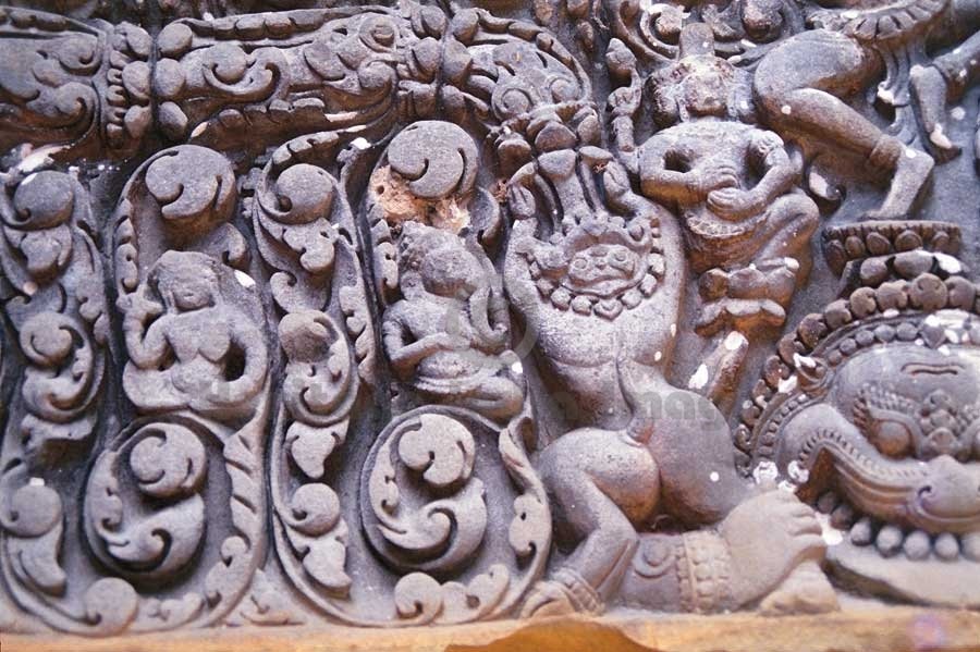 Preah Khan - Kal. Dedicated to Lord Vishnu and Lord Buddh, it was bulit by King Jayavarman VII in AD 1191 in memory of his father. Preah Khan was conscerated in 1191 to Boddhisatva Lokeshwara, Jayavarmeshwar. It was built by Jayavarman VII in the memory of his father Dharanindravarman. The statue was placed in the central sanctuary. There are three temples around the central sanctuary. The north temple is dedicated to Lord Shiv, west temple to Lord Vishnu and south temple to other deities. According to the insctiption found in the temple, 1500 tonnes of copper was used for ornamenting the walls. The entrance of the temple is flanked by devatās and asuras and people were residing inside its premises. It is located on the north of its own baray called Jayatatāk covering 56 hectares. It was a temple, monastery and a centre of learning. (Image # 00225).