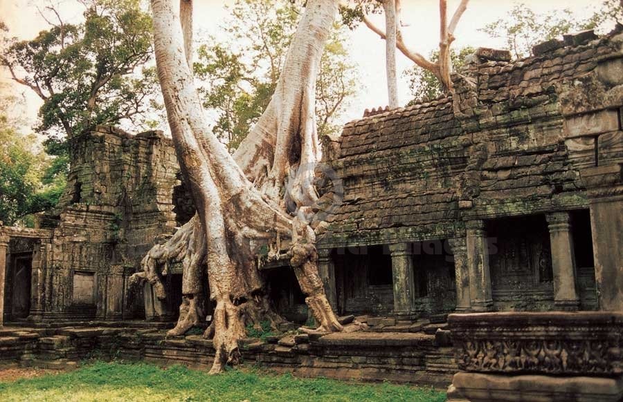Trees grown on the difice of the temple - Preah Khan. Dedicated to Lord Vishnu and Lord Buddh, it was bulit by King Jayavarman VII in AD 1191 in memory of his father. Preah Khan was conscerated in 1191 to Boddhisatva Lokeshwara, Jayavarmeshwar. It was built by Jayavarman VII in the memory of his father Dharanindravarman. The statue was placed in the central sanctuary. There are three temples around the central sanctuary. The north temple is dedicated to Lord Shiv, west temple to Lord Vishnu and south temple to other deities. According to the insctiption found in the temple, 1500 tonnes of copper was used for ornamenting the walls. The entrance of the temple is flanked by devatās and asuras and people were residing inside its premises. It is located on the north of its own baray called Jayatatāk covering 56 hectares. It was a temple, monastery and a centre of learning. (Image # 00264).