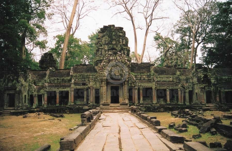 Ta Prohm. Dedicated to Prajñaparamitā, it was bulit by King Jayavarman VII in AD 1186 in memory of his mother. It was left unrestored after its discovery. Ta Prohm was consecrated in 1186 to Prajñaparamitā. It was built by King Jayavarman VII in the memory of his mother Jayadevi and its original name was “Rājavihār” meaning royal monastery. According to its inscription, 12640 people were living inside it for its maintenance. Its outer wall measures 1000 m E-W and 650 N-S. Unlike other Angkor temples, Ta Prohm was not restored and was left to its natural state as it was in the 19th century at the time of its discovery. The vegetation and trees abound the ruins which provide a glimpse of the atmosphere that has prevailed for centuries. (Image # 00263).