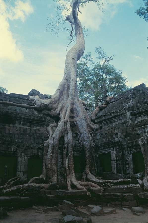 Trees grown on the edifice of the temple - Ta Prohm. Dedicated to Prajñaparamitā, it was bulit by King Jayavarman VII in AD 1186 in memory of his mother. It was left unrestored after its discovery. Ta Prohm was consecrated in 1186 to Prajñaparamitā. It was built by King Jayavarman VII in the memory of his mother Jayadevi and its original name was “Rājavihār” meaning royal monastery. According to its inscription, 12640 people were living inside it for its maintenance. Its outer wall measures 1000 m E-W and 650 N-S. Unlike other Angkor temples, Ta Prohm was not restored and was left to its natural state as it was in the 19th century at the time of its discovery. The vegetation and trees abound the ruins which provide a glimpse of the atmosphere that has prevailed for centuries. (Image # 00272).