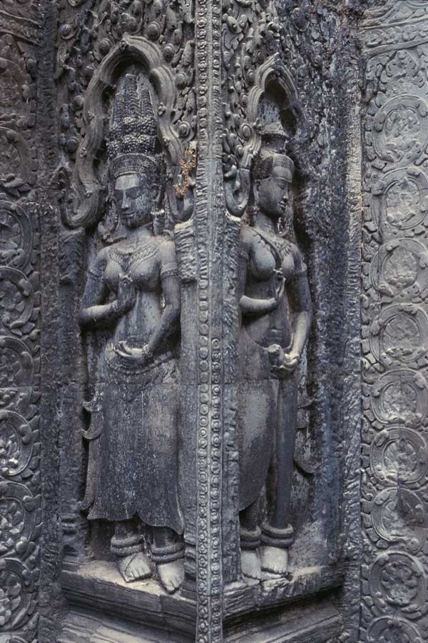 Apsara - Ta Prohm. Dedicated to Prajñaparamitā, it was bulit by King Jayavarman VII in AD 1186 in memory of his mother. It was left unrestored after its discovery. Ta Prohm was consecrated in 1186 to Prajñaparamitā. It was built by King Jayavarman VII in the memory of his mother Jayadevi and its original name was “Rājavihār” meaning royal monastery. According to its inscription, 12640 people were living inside it for its maintenance. Its outer wall measures 1000 m E-W and 650 N-S. Unlike other Angkor temples, Ta Prohm was not restored and was left to its natural state as it was in the 19th century at the time of its discovery. The vegetation and trees abound the ruins which provide a glimpse of the atmosphere that has prevailed for centuries. (Image # 00281).