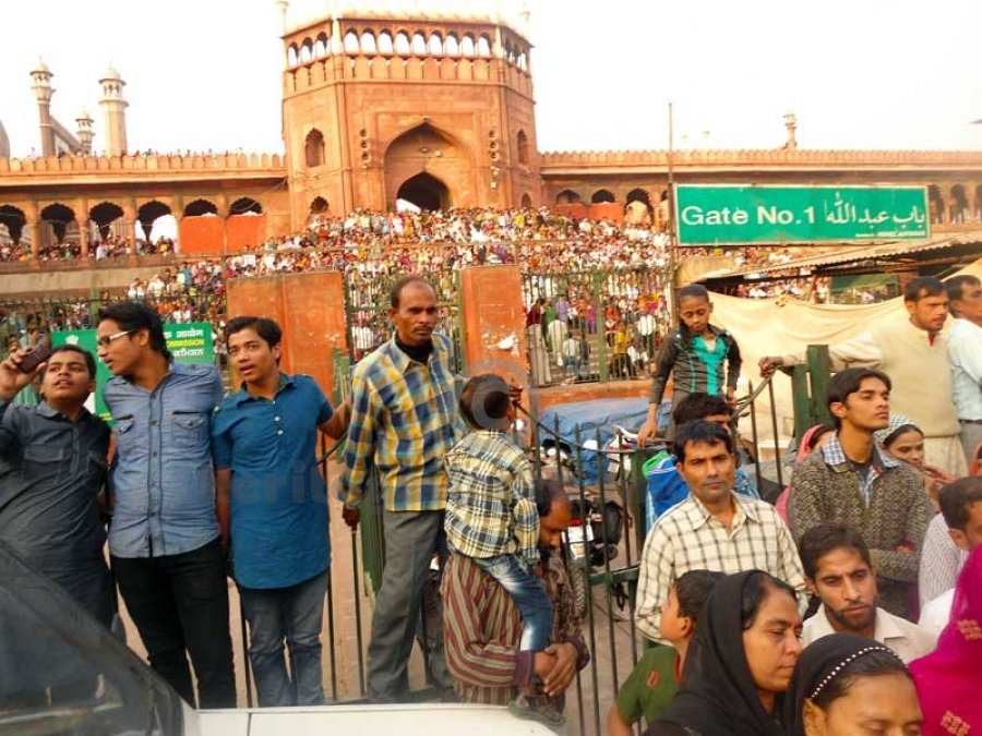 The Masjid-i Jahan-Numa, the 'World-reflecting Mosque', commonly known as the Jama Masjid of Delhi, is the principal mosque of Old Delhi in India. Commissioned by the Mughal Emperor Shah Jahan, it is the second largest and best-known mosque in India. The construction began in 1650 and was completed in 1656. It lies at the beginning of the Chawri Bazar Road, a very busy central street of Old Delhi.The later name, Jama Masjid, refers to the weekly Friday noon congregation prayers of Muslims, Jummah, which are usually done in a mosque, the "congregational mosque" or "jama masjid".The courtyard of the mosque can hold up to twenty-five thousand worshippers. The mosque also houses several relics in a closet in the north gate, including an antique copy of the Qur'an written on deerskin.