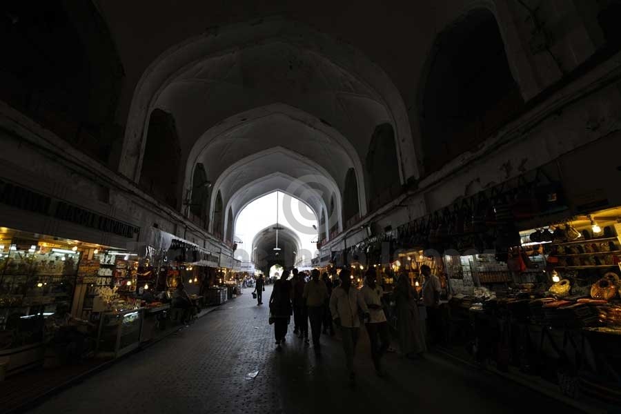 Adjacent to the Lahori Gate is the Chatta Chowk, where silk, jewellery and other items for the imperial household were sold during the Mughal period. The bazaar leads to an open outer court, where it crosses the large north-south street which originally divided the fort's military functions (to the west) from the palaces (to the east). The southern end of the street is the Delhi Gate.